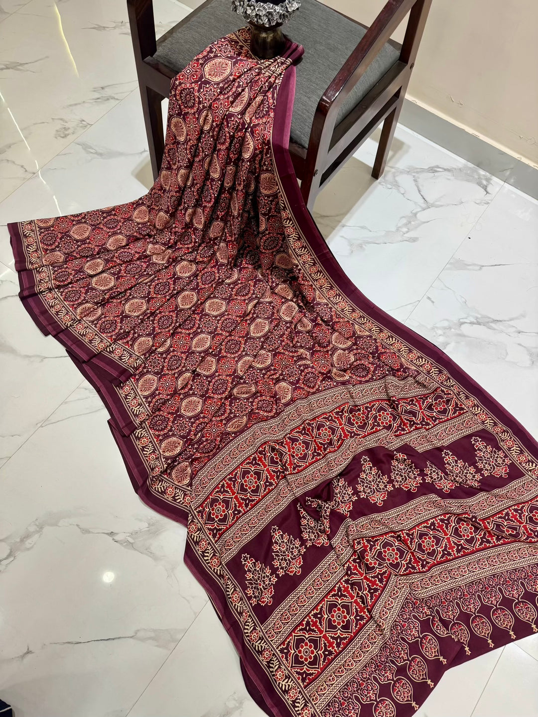 Deep Wine Pure Modal Silk Ajrakh Saree with Intricate Artisan Prints